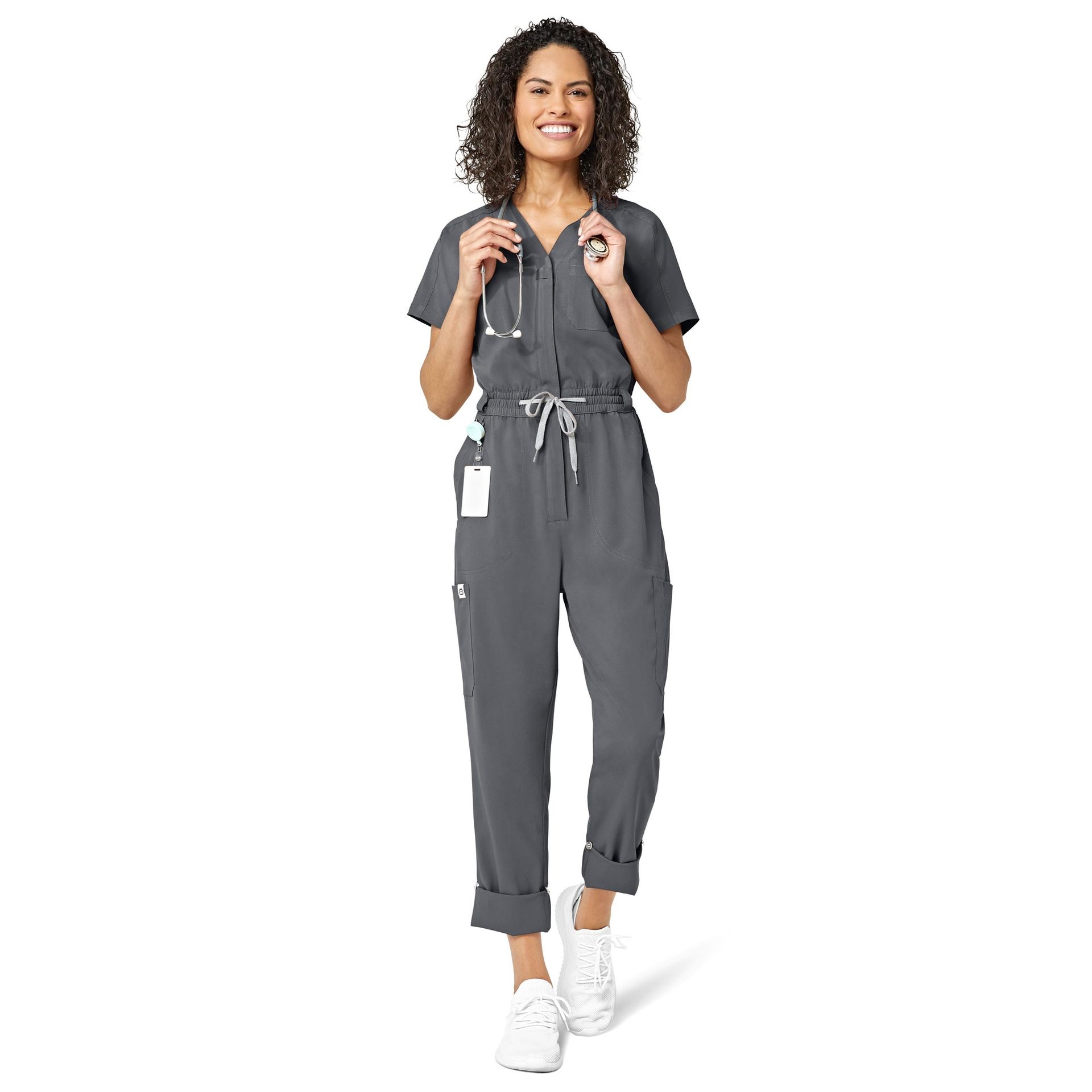 - Abbottonatura con scollo a V con passante in grosgrain per badge o occhiali da vista